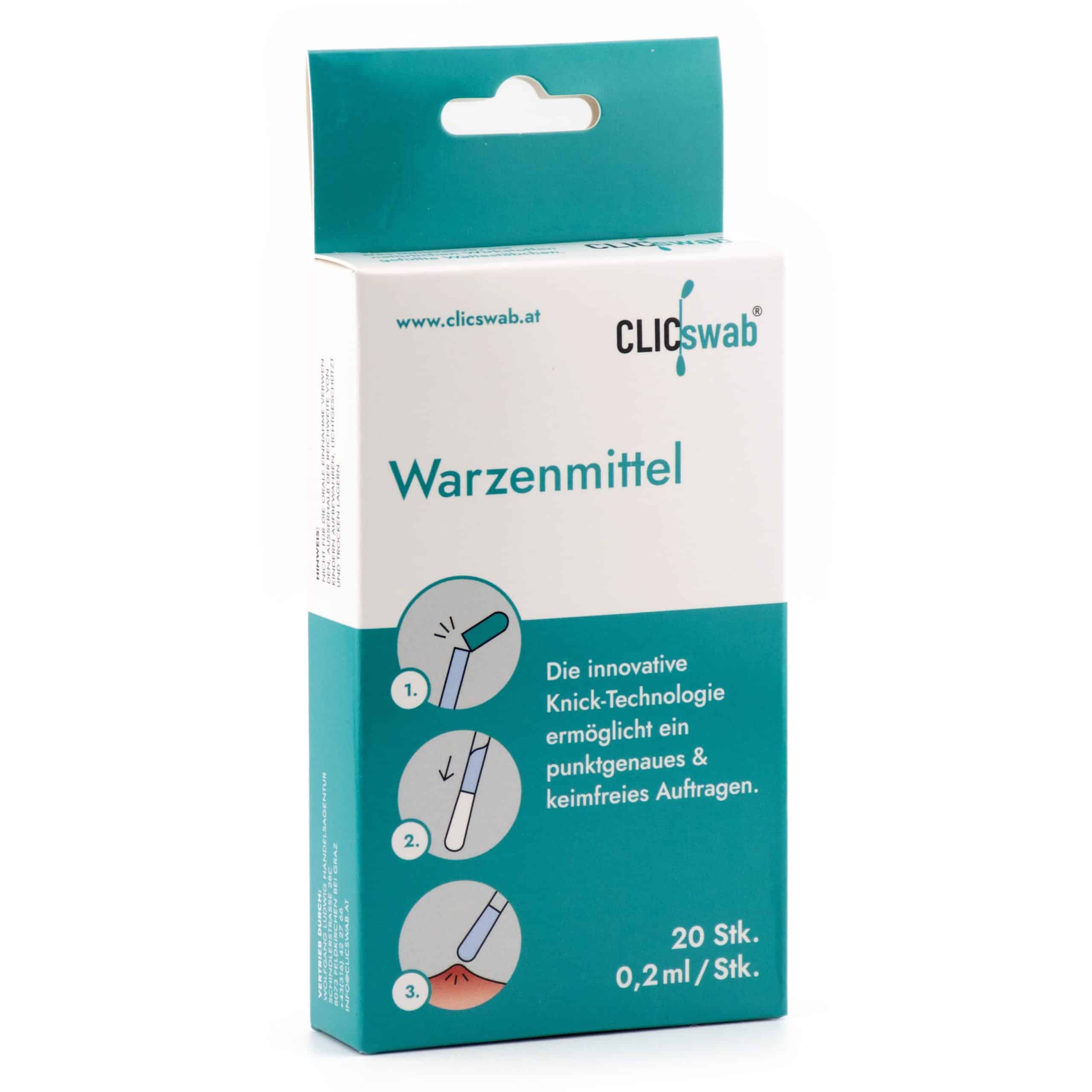 CLICswab® ist in der Regel für die Behandlung von gewöhnlichen Warzen (Verruca vulgaris) und Dornwarzen (Verruca plantaris) geeignet. Bei anderen Warzenarten, wie z.B. Feigwarzen (Condylomata acuminata), sollte vor der Anwendung ein Arzt konsultiert werden.