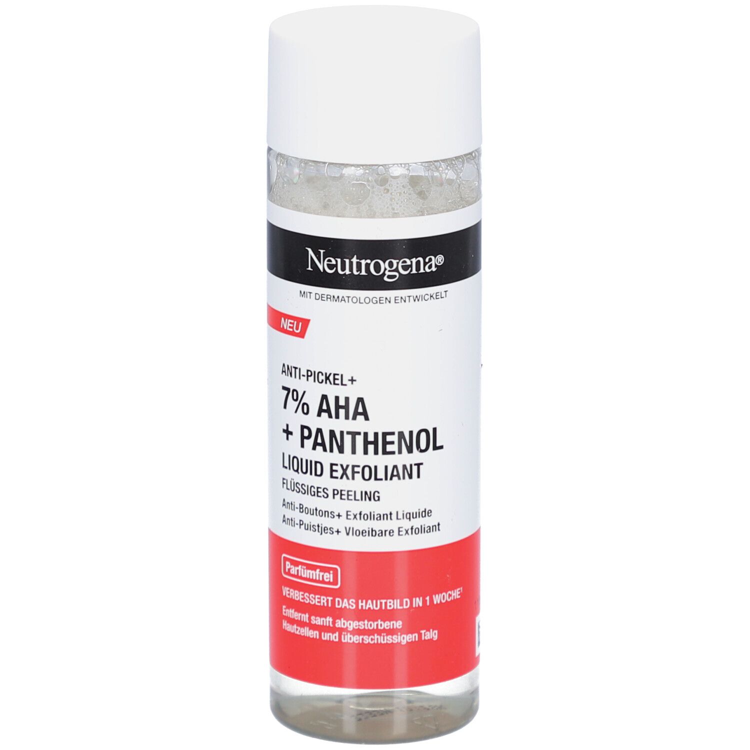 Das Neutrogena® Anti-Pickel+ Flüssige Peeling ist eine kraftvolle Kombination aus exfolierenden AHAs (Alpha-Hydroxysäuren) und beruhigendem Panthenol. Diese einzigartige Formel bietet eine Vielzahl von Vorteilen für Ihre Haut: